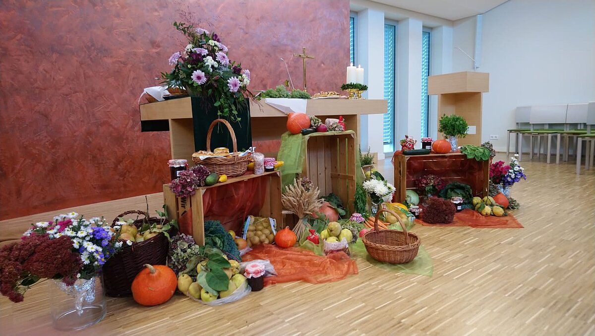 Im Gegensatz zu den etwas beengten Verhältnissen in der Antoniuskapelle, konnten in diesem Jahr in unserem Gottesdienstsaal wieder die vielen gespendeten Erntegaben aufgestellt werden. Es war ein sehr schönes, buntes Bild. Viele Gemeindeglieder haben Selbstgeerntetes mitgebracht wie Kürbisse, Kartoffeln und Äpfel. Andere haben selbstgemachte Marmeladen und Gelee gespendet. All diese Gaben wurden nach dem Gottesdienst zugunsten der Gemeinde verkauft. Endlich konnten wir auch wieder das Erntedankfest mit einem gemeinsamen Kartoffelessen ausklingen lassen. Neben Pellkartoffeln gab es selbstgemachte Dips, köstlichen Heringssalat und Kräuterbutter. Über 30 Teilnehmende ließen es sich sehr schmecken. Es wurde viel gelacht und angeregte Gespräche geführt.
