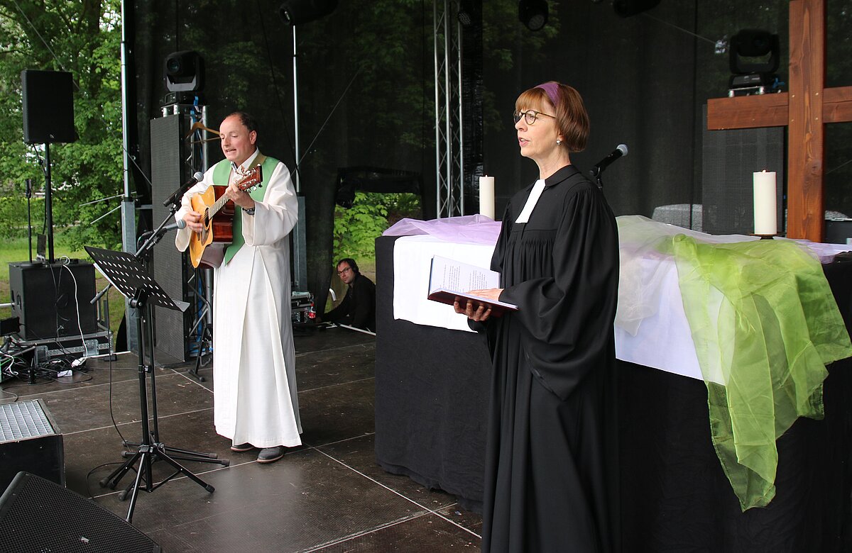 Der katholische Gemeindereferent Christof Stracke und die evangelische Pfarrerin Gabriele Hische waren zum Zuspruch des ersten ökumenischen Autogottesdienst sehr angetan. Rund 70 Autos waren gekommen, um dem über eine UKW-Frequenz in die Autoradios übertragenen Gottesdienst zu lauschen. Der Gottesdienst fand im Rahmen eines dreitägigen Autokonzertes mit mehreren musikalischen Darbietungen statt. Foto: Axel Langer