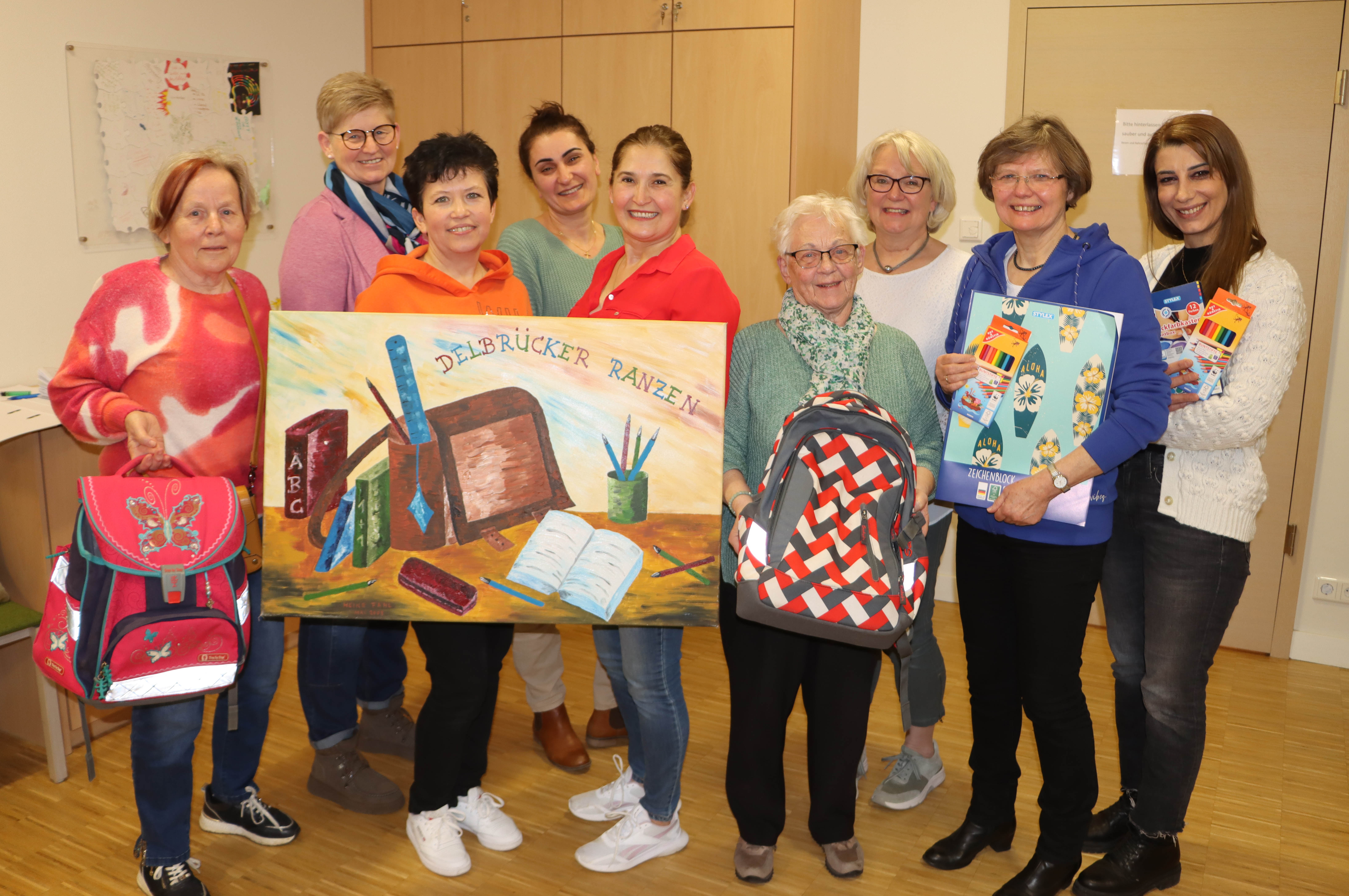 Im Jahr 2023 versorgte der Delbrücker Ranzen 245 Schüler mit Schulmaterialien und übertraf damit das schon hohe Ergebnis des Vorjahres. Aktuell bereiten (von links): Ulla Ramsel, die Caritas-Koordinatorin Ursula Bökmann, die zweite Vorsitzende Tanja Geiß, Randa Dag, Roze Özmen, Ursula Richter, Fachbereichsleiterin Brigitte Strunz, die erst Vorsitzende Anneliese Hippauf und Schriftführerin Rana Hanna die neue Ausgabetermine für die Sommerferien vor.